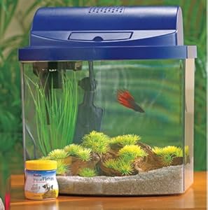 After the most recent demise of my last Betta- Hot Temper, who bless his heart, lived 2 years in a 1 gallon fish bowl, I found myself in a fish store (not so soon after, I did mourn the little guy). Wandering about I could not deny my instant love for a feisty beautiful little guy the size of a small drapery tassel, I brought him home (instant gratification and instant love is my middle name)...and proceeded to give him 'Hot Temper's' life all over again (yes...in a bowl), but this time I thought he might benefit from living at work with me (I work all the time)...fast forward to cute little fish, living on my desk, and between calls me looking up just what might make him happy (er)...I come to a sudden realization that I sucked as a fish mom(formerly) and needed to give the little guy what he truly deserved, more oxygen, more "toys", more room and heat. I bought this little aquarium wonder (w/a black top),bye bye bowl, and wow have I got one happy fish! This tank is an easy set up,the filter (that worried me sick) is great, it will not swallow or eat your Betta (as far as I can tell so far...thank goodness!),he is not struggling through any major currents and as far as I can tell, he is a happy camper (or show off). I purchased a small heater to keep his temp at what is most conducive to his normal habitat, my Betta is making bubbles nests, and showing off like a full finned champ. I always thought I had a happy Betta, until now, this fish is unbelievably active and showy. I know it's a fish, but he sure reminds me of a puppy with fins! I love this little tank, perfect on a desk top, easy to set up, perfect for a Betta (just buy a heater, plants, gravel and hiding nook and you're set!) Love this!!