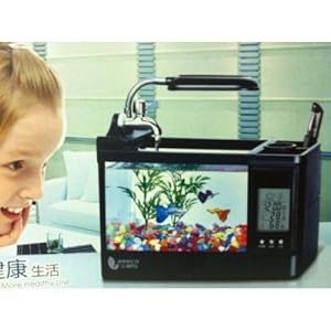 iBRIGHT aquarium- Lighted desktop aquarium that has compartments to hold pens, pencils and other desktop utilities. Equipped with an easy to set am/pm alarm clock, Celsius and Fahrenheit temperature readings, and also displays the day of the week. Also comes with small pebbles and plastic plants for the fish tank. Comes in Black, pink and blue.